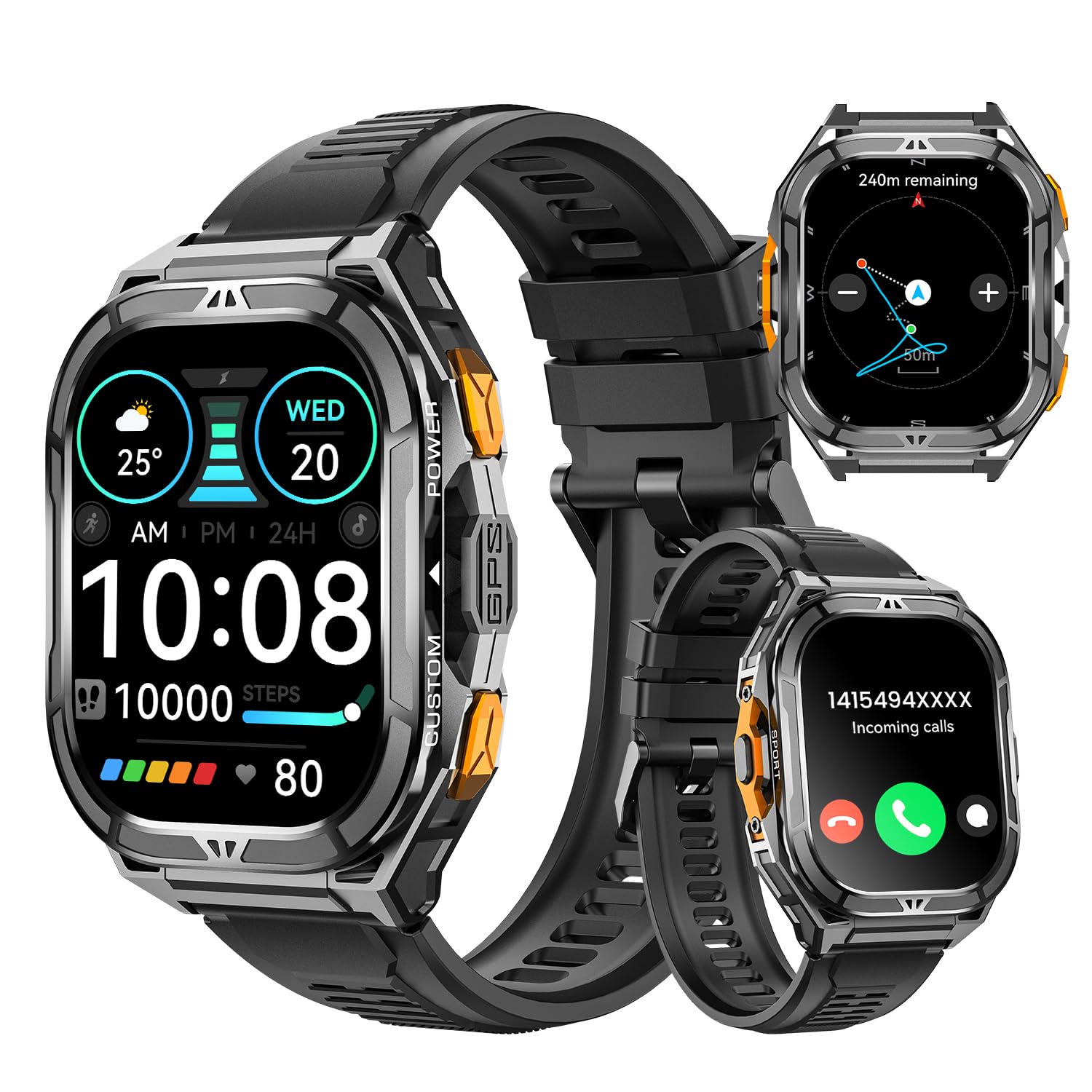 Smartwatch for Men GPS Sports Watch, 1.96″ AMOLED Display, 5ATM Waterproof Metal Military Smart Watches, Fitness Activity Tracker with Compass Pedometer Sleep/Heart Rate Monitor for Android iOS Black