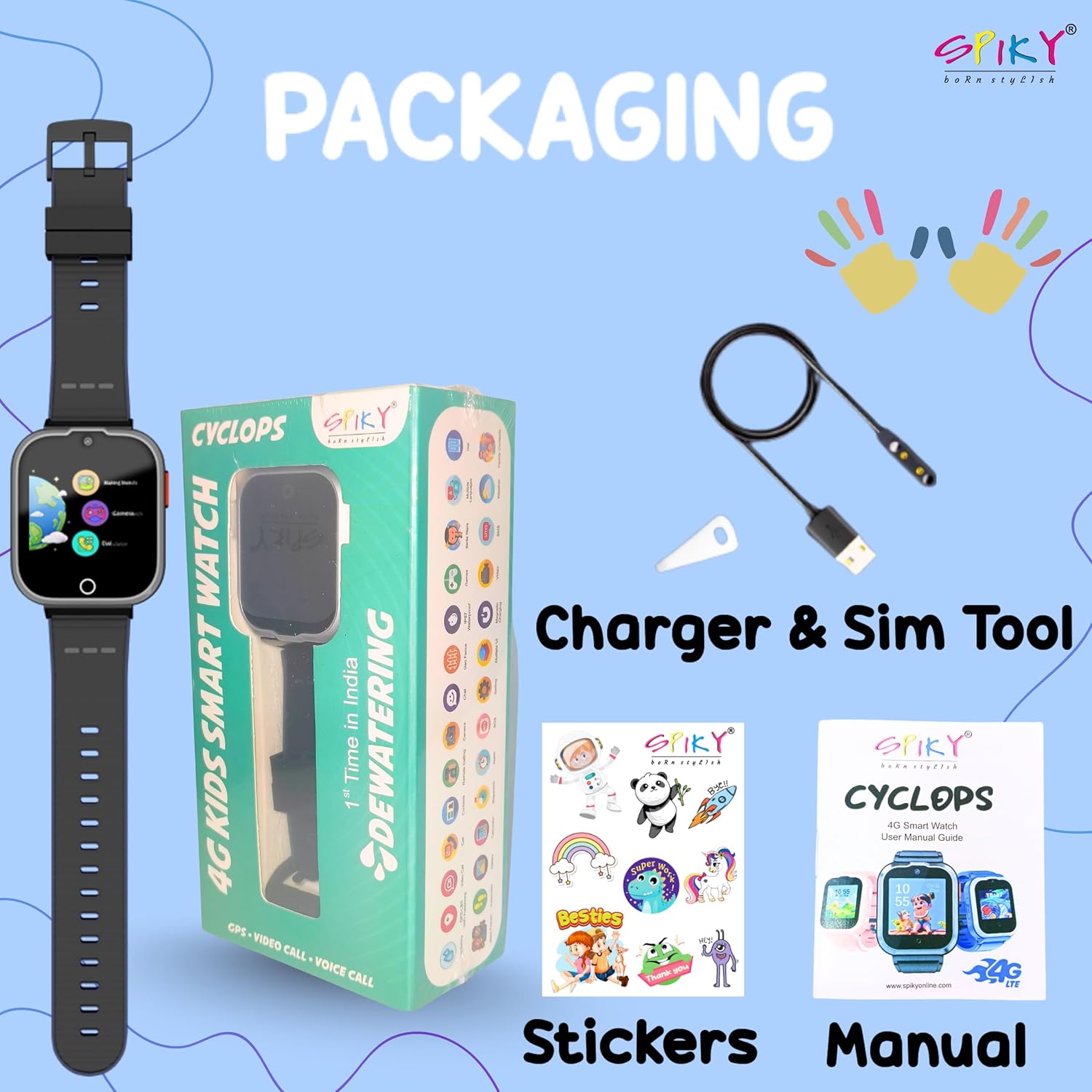 Complete Package: Includes Spiky 1 Smartwatch, 1 Charging Pin, a warranty card, user manual, cartoon stickers and hassle-free packaging.