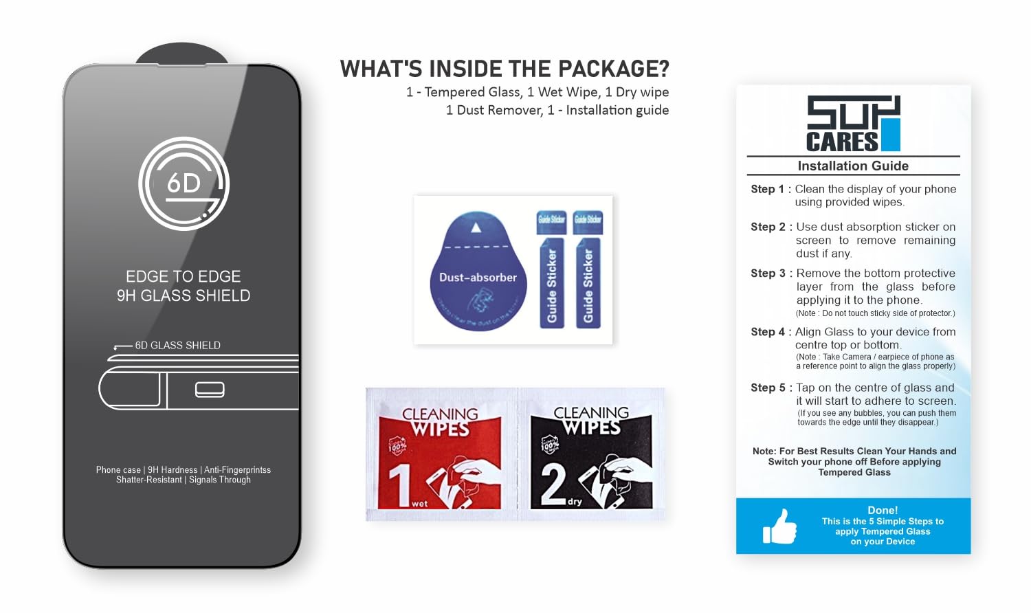 Compatible Device: This Tempered Glass is Perfectly compatible with iPhone 15 and iPhone 16 (6.1 Inch). Easy Installation: This is a edge to edge screen protector, Bubble free adhesive and easy to install. You can follow installation guidelines which printed on Installation guide. Box Includes: Tempered Glass, Wet wipe, Dry Wipes, Dust absorber sticker with installation guidelines.