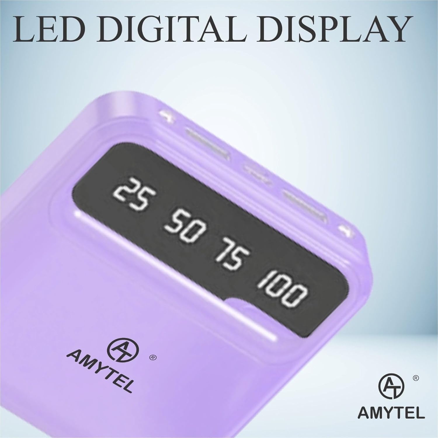 The AMYTEL T95 Chotu 10,000mAh Mini Power Bank is a compact and versatile portable charger designed for everyday use with smartphones, tablets, smartwatches, earbuds, speakers, and trimmers. With a 10,000mAh Lithium Polymer battery, it provides reliable backup power for multiple device charges. Its unique built-in 4-wire design supports USB, Micro USB, USB-C, and Lightning connectors, eliminating the need for carrying extra cables. Equipped with fast charging up to 15W and dual output ports, it ensures efficient charging of devices simultaneously. The mini pocket-size form factor (707020mm, 200g) makes it extremely portable, while the LED flashlight and digital display provide added convenience for outdoor use or emergency situations. Built-in safety features protect against overcharge, over-discharge, and short-circuit risks. Backed by a 6-month replacement warranty, the T95 Chotu combines compactness, convenience, and reliable performance in a sleek Purple design.