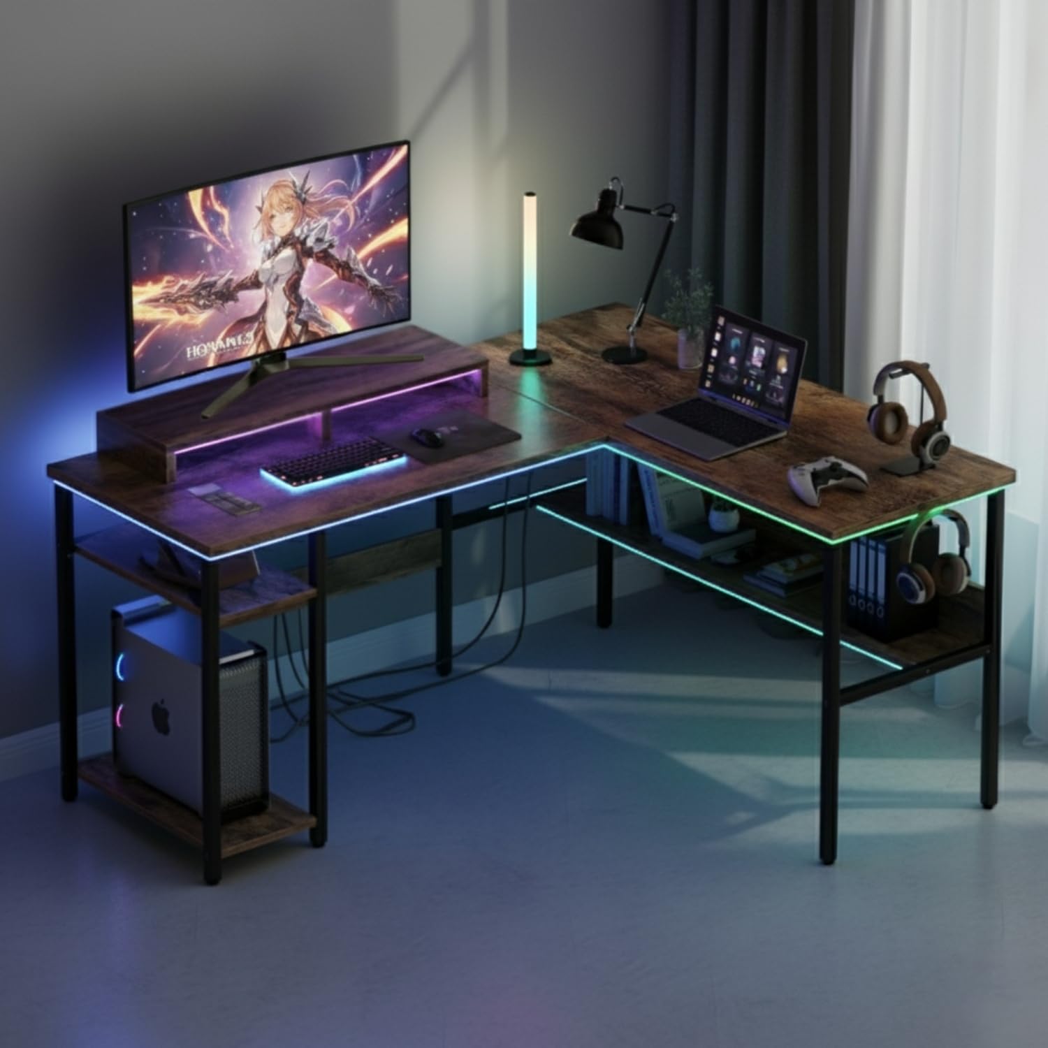 STORAGE SPACE: 150 x 120 cm wide L-shaped computer desk and 3 open shelves.