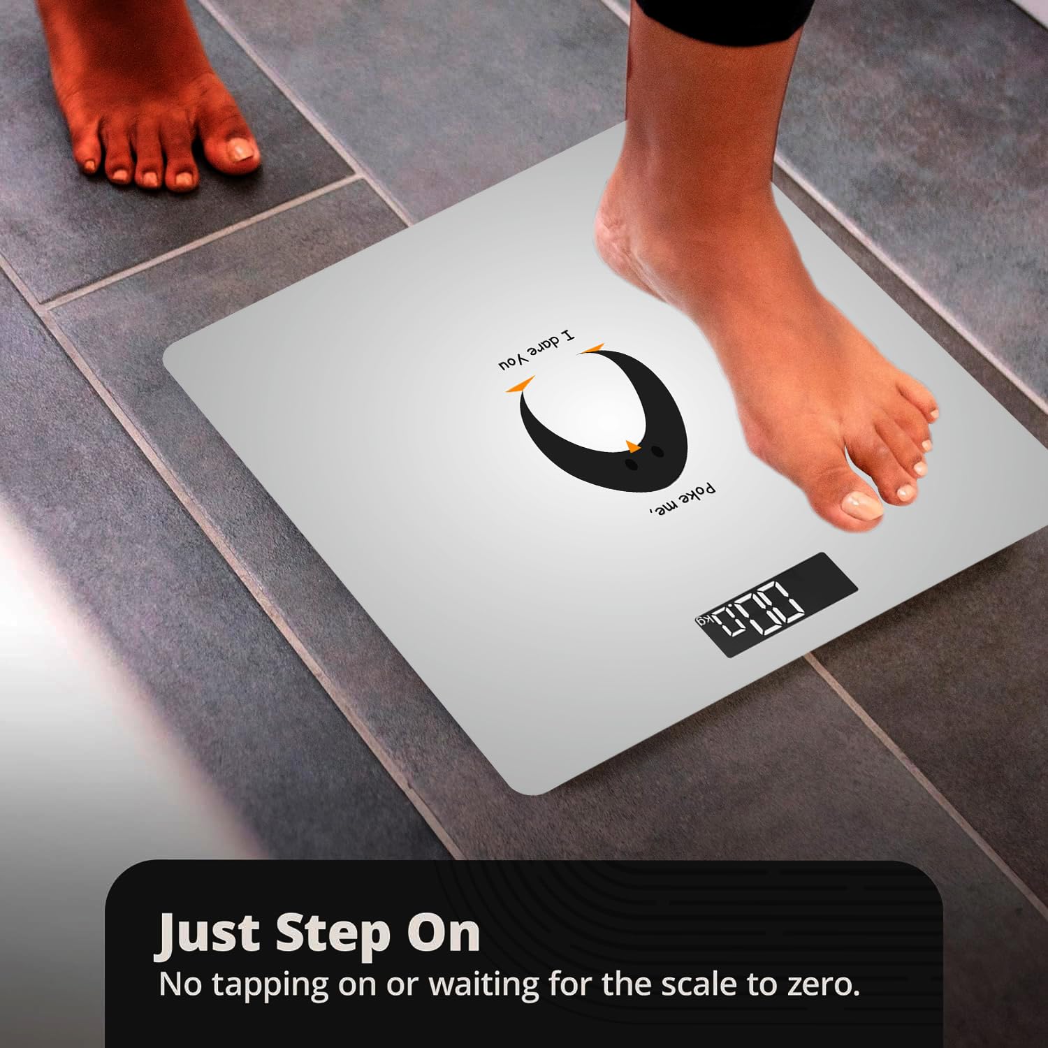 Made of super strong tempered glass, which allows measuring weight up to 400 lbs/180 kg.Step-on technology allows you to simply step onto the scale and you will have an accurate readout in seconds.Large bright LCD automatically lights up with each measurement so you can easily read your results even in the dark.High precision sensors and non-slip rubber padding to keep the weighing platform stable and would not scratch floors.