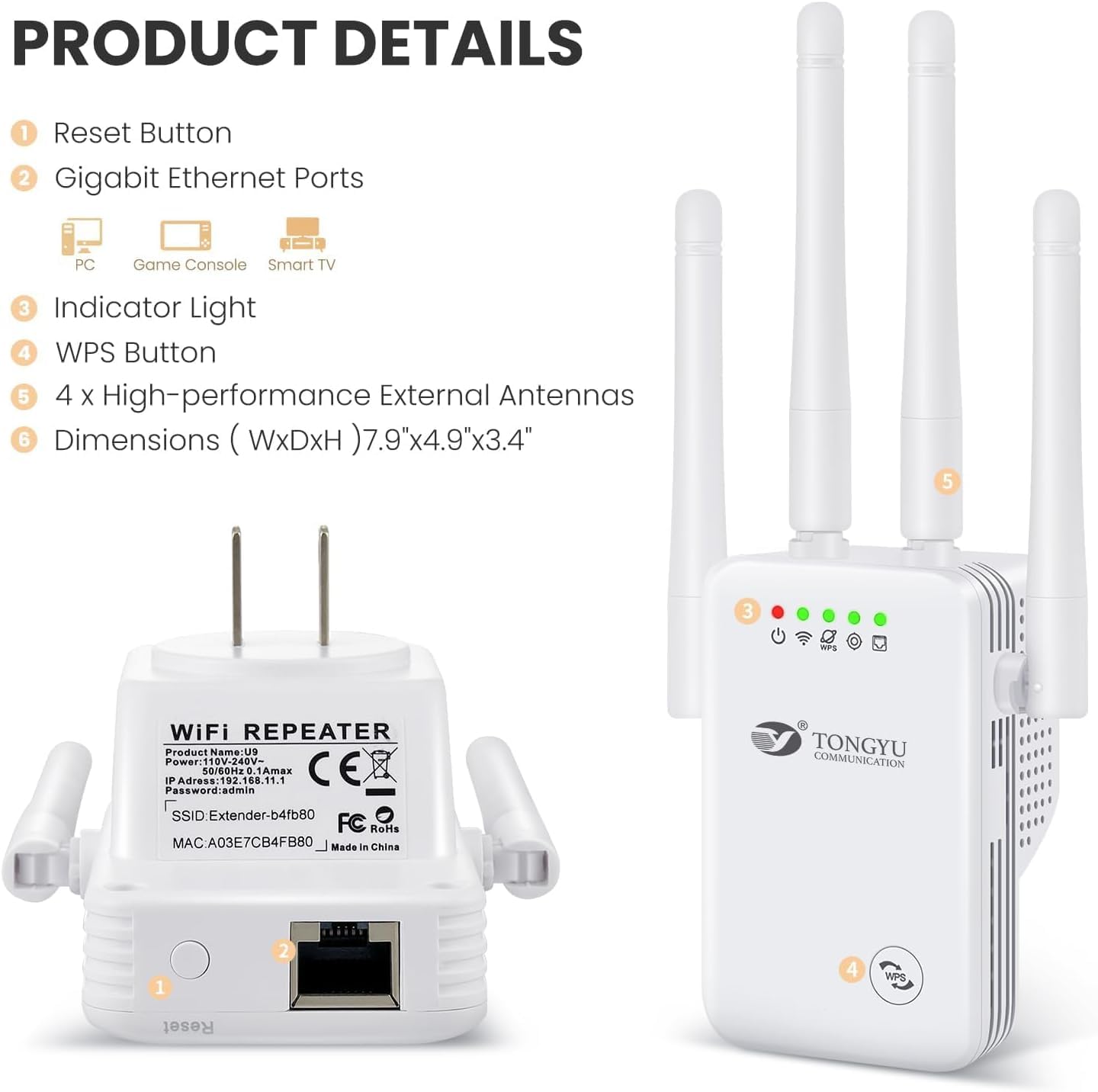 [Covers up to 5000 square feet] The wifi range extender has 4 external antennas with MIMO technology, its 2.4Hz band 300Mbps can easily penetrate obstacles such as floors, eliminating annoying wifi dead zones and minimizing data transmission Lost lets you enjoy HD streaming and lag-free gaming anytime.