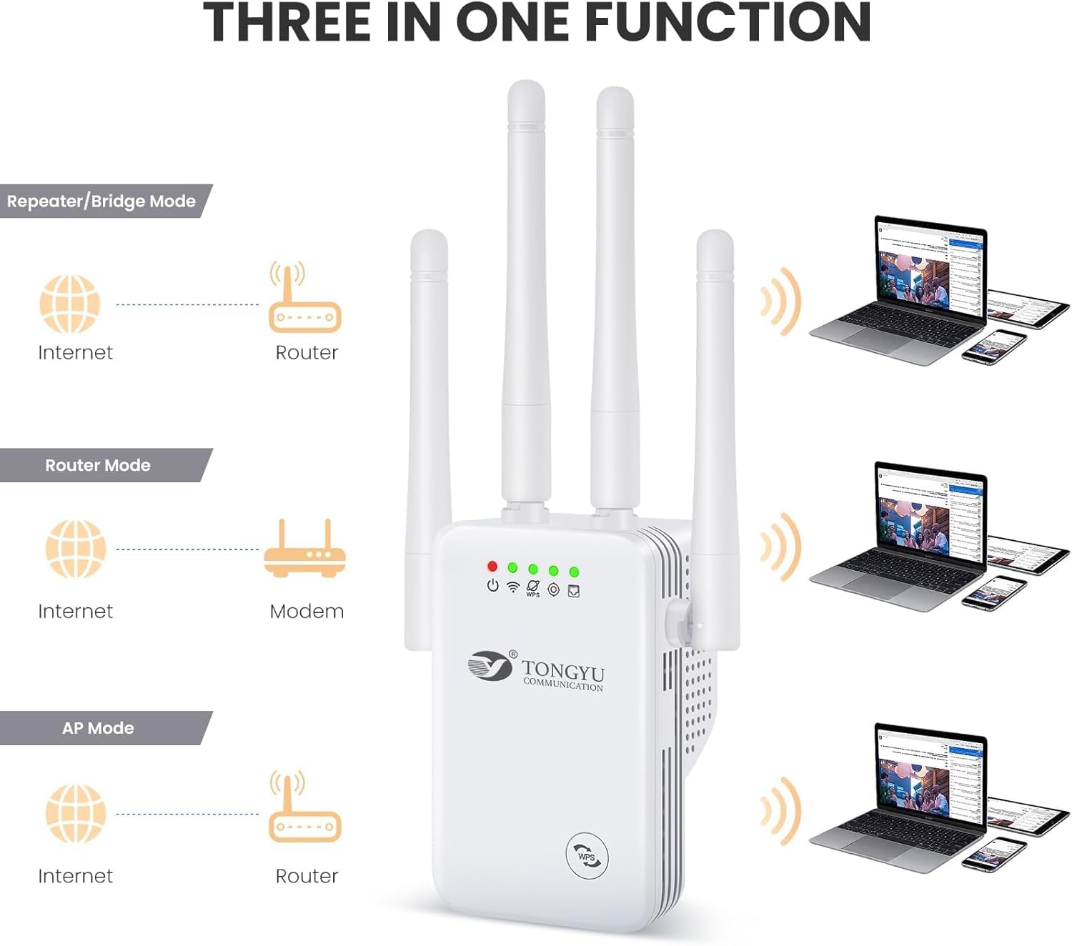Tongyu 300Mbps WiFi Repeater/Extender Signal Booster for Home and Outdoor,Full Coverage 5000 sq.ft and 35 Devices WiFi Range Extender,with Repeater,Ap,Router 3-in-1 Function