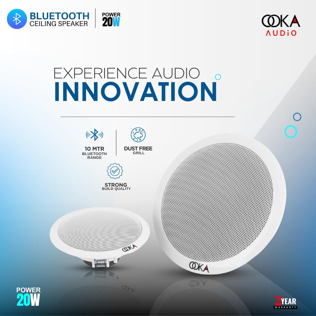 Premium Bluetooth 5.0 Ceiling Speaker – OOKA AUDiO Twins 707 features a 6″ full-range flush mount speaker with 40W RMS output (10W Master + 10W Slave) delivering crystal clear background music across any indoor space. Bluetooth Range – 10 meter