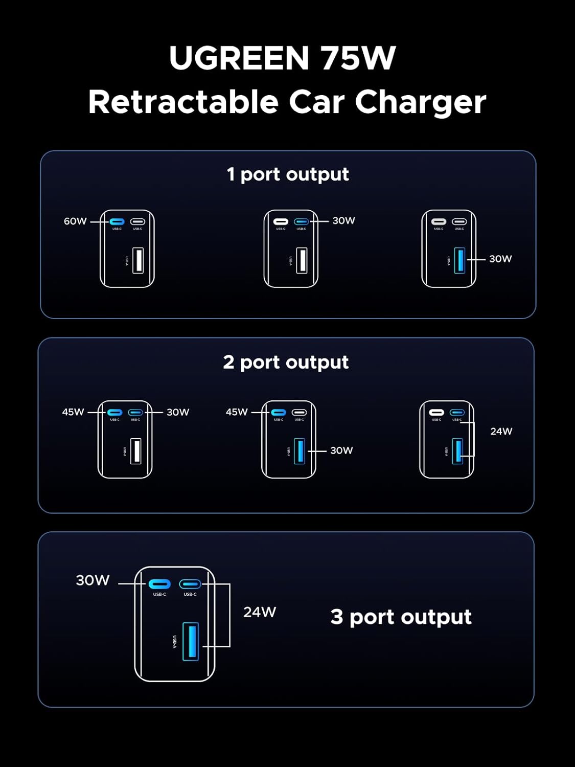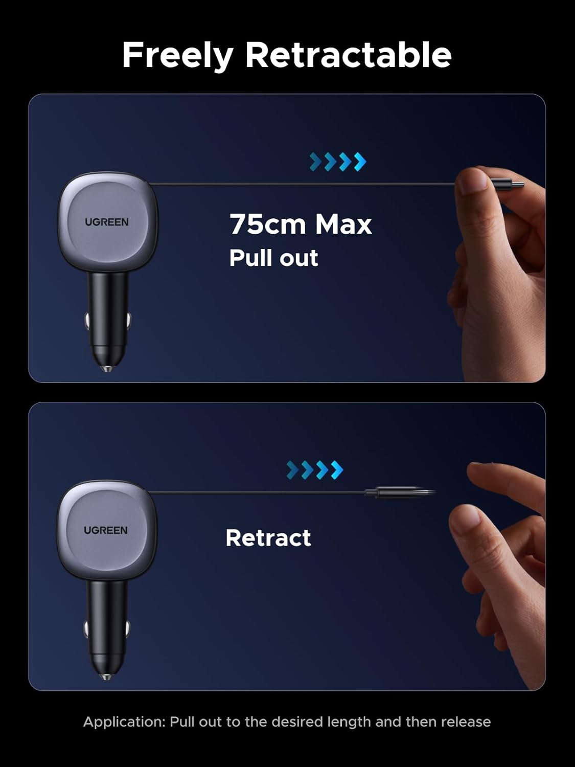 75W Fast Charging: This UGREEN car charger boasts a maximum total output of 75W. The retractable USB-C cable supports up to 60W output, while both the USB-C and USB-A ports can deliver a maximum of 30W, ensuring fast charging for your devices