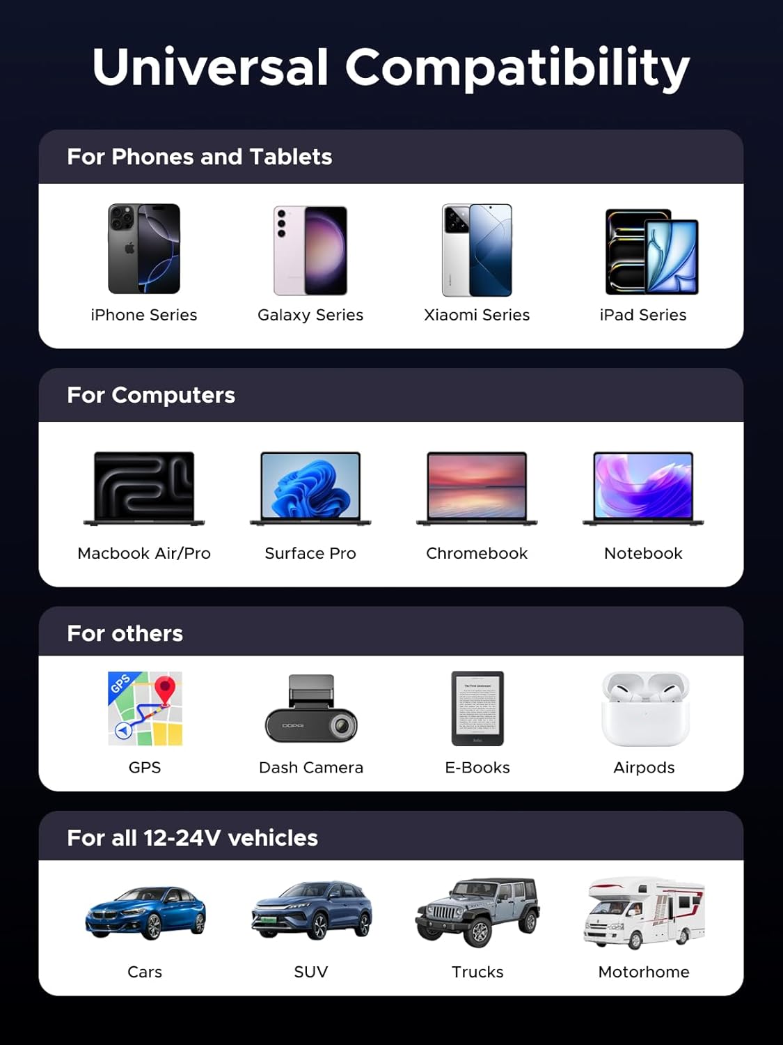 Universal Compatibility: Compatible with 12~24V vehicles, this usb c car charger is suitable for laptops like Macbook Pro, Surface Pro, Chromebook, phone series like iPhone 16/15, Galaxy S25/S24/23, and other devices like iPad, iPods, Dash Cameras, etc