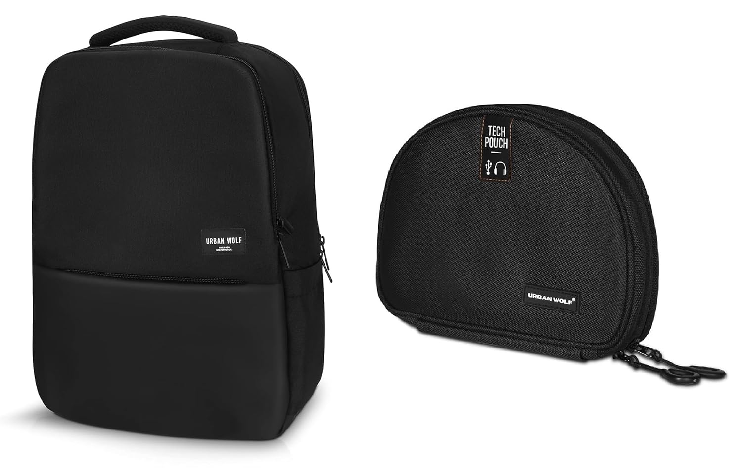 URBAN WOLF 30L Water Resistant Laptop Backpack Bags And Tech Pouch Combo | Backpacks for Office/College/School/Men/Women | Travel Tech Pouch For Cables, Adapters, Chargers, Hard Drives