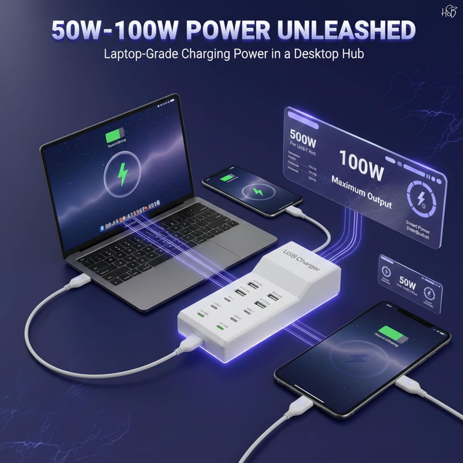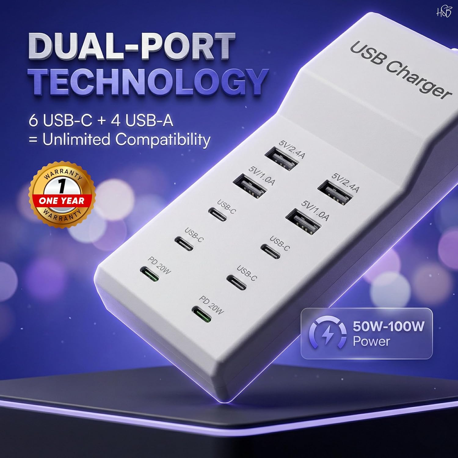 USB-C Charger Hub 50W–100W – 10-Port Desktop Charging Station with 6 USB-C & 4 USB Ports, High-Power Electric Charging Dock for Phones, Tablets & Batteries