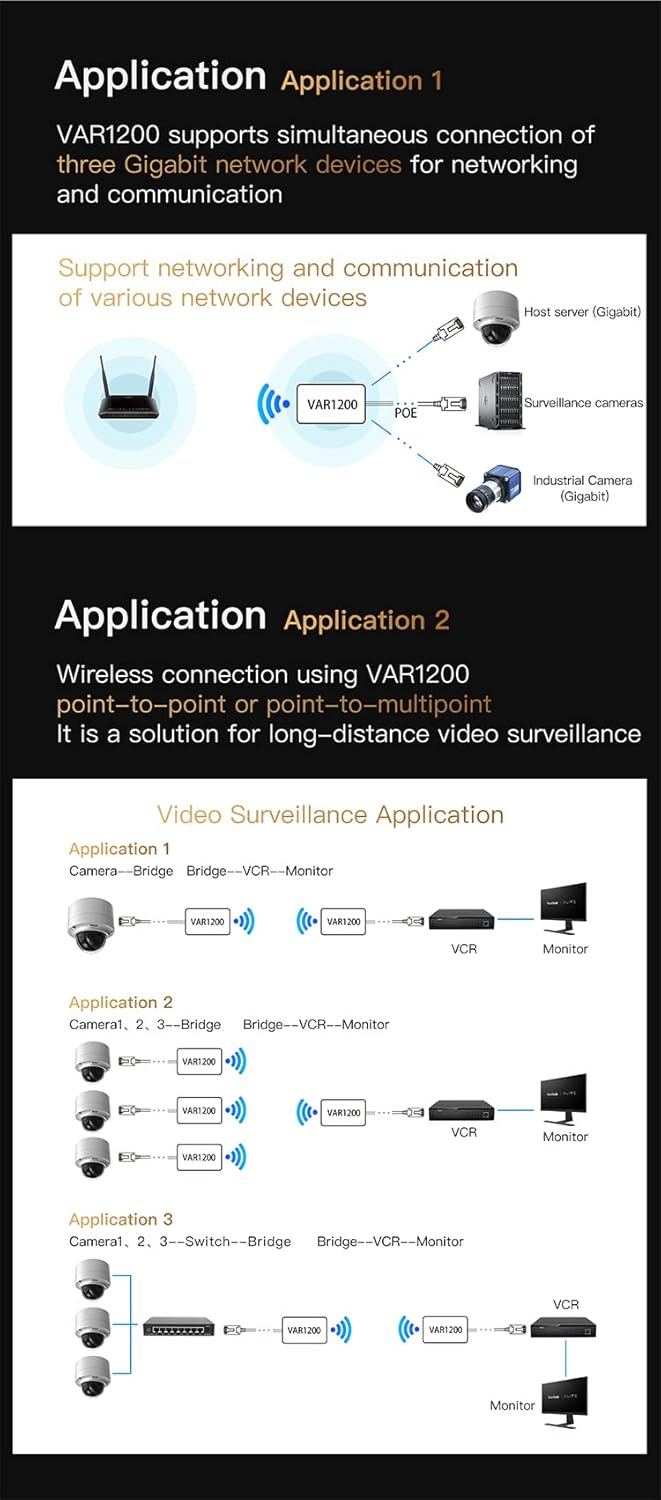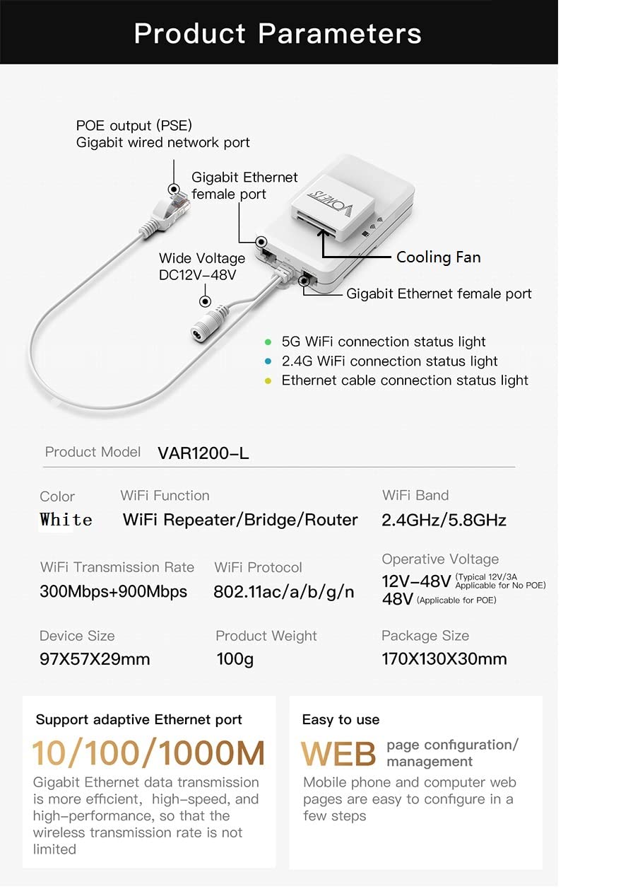 VONETS VAR1200-L is an Industrial Gigabit Dual Band 2.4GHz/5GHz PoE WiFi Repeater Wireless Bridge Ethernet Router WiFi Bridge with Ethernet Port, Wireless Bridge Point to Point WiFi to Ethernet Adapter