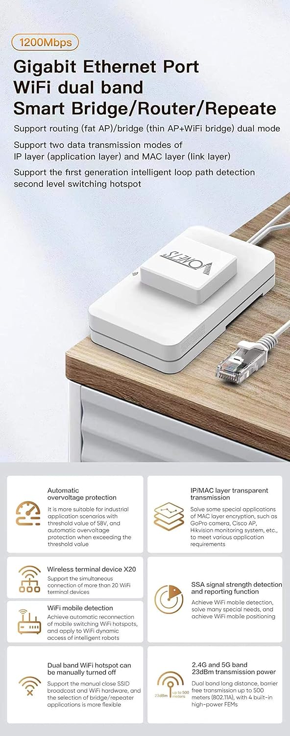 Gigabit WiFi Bridge/Repeater/Router Mini Dual Band 2.4GHz/5GHz PoE Gigabit WiFi Bridge Ethe wireless repeater WiFi adapter to Ethe/WiFi bridge with ethernet port, WiFi Hotspot signal range extender cover; can achieve the function wireless-wired, wire-to-wireless; 3 Gigabit ports (1000Mbps) and PoE (output) DC powered. Internal antennas;