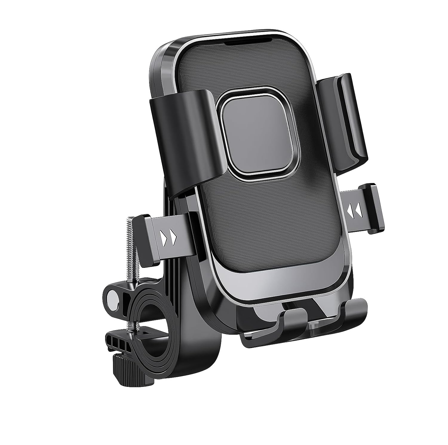 Bike Mobile Holder Sturdy and Safe A special shape of this motorcycle & bike phone holder grips each corner of your phone tightly. It ensures the safety of your cell phone attached to the bike handlebar even on a bumpy road. Phone clip must be locked by the red switch on the back so that the phone does fall off while riding!