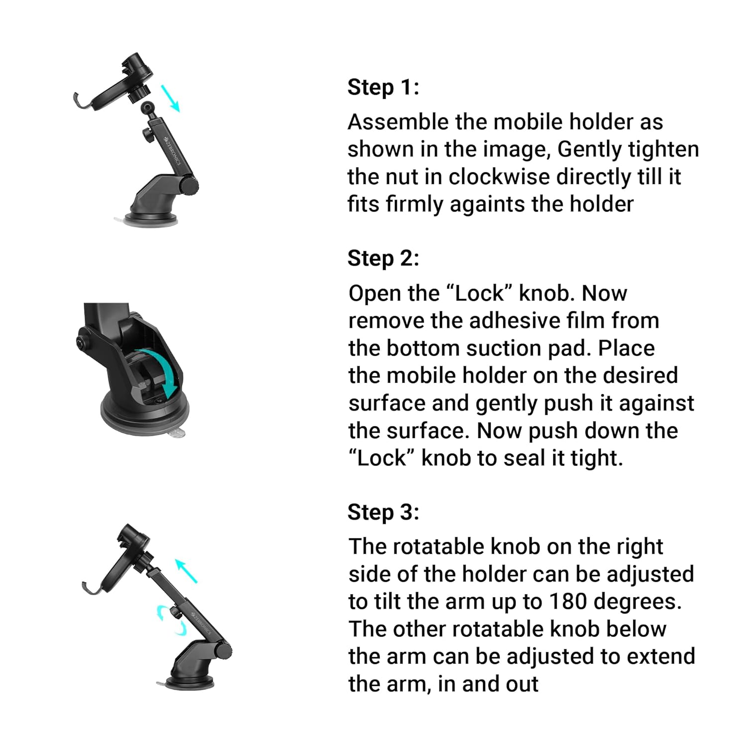 Strong Suction Cup: Equipped with a strong suction cup and an extendable telescopic arm (up to 60mm), the ZEB-WCC150 adheres securely to your windshield or dashboard and can be adjusted according to convenience.