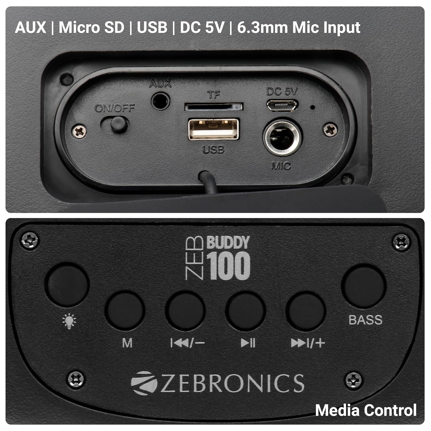 ZEBRONICS Zeb-Buddy 100 Portable BT v5.0 Speaker with TWS, 20W RMS, Wired mic Karaoke, 5H Backup, RGB LED, AUX, USB, Micro SD, Built in Rechargeable Battery and Mobile Holder, Black